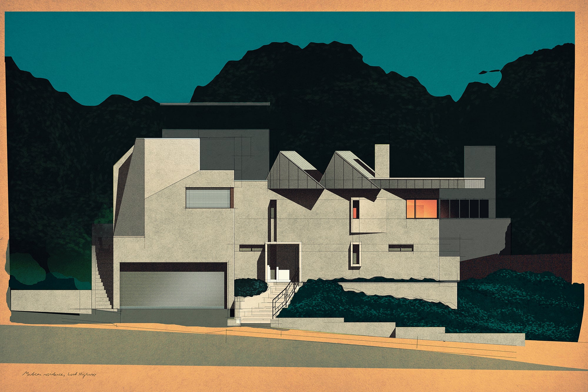 Hidden just below Mulholland Drive sits the so-called Madison Residence, part of the former compound of filmmaker David Lynch in the Hollywood Hills. The residence became visually immortalized in the unsettling world of Lost Highway.